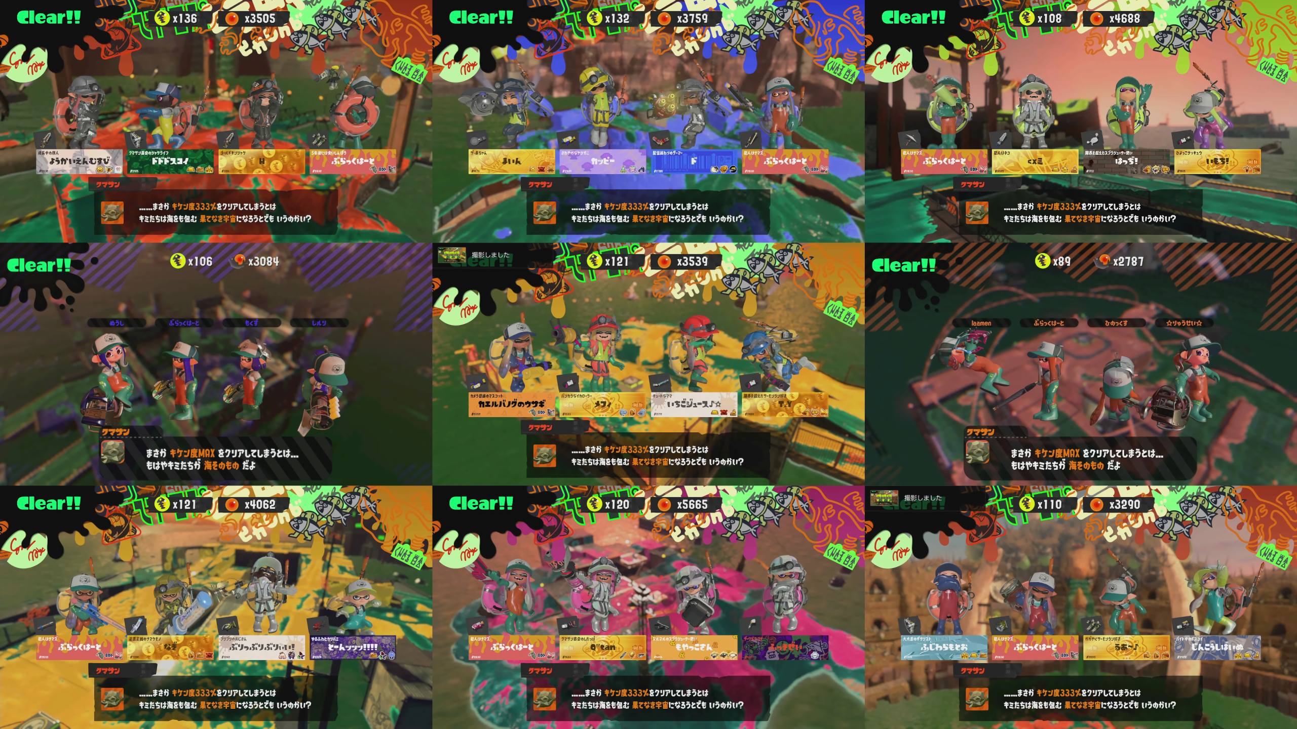 ●ムニ・エール海洋発電所 : 完走編成(スクイク/52/スプスピ/1枠緑)初キケン度MAXクリア&完走&キケン度MAX連合討伐マップ。初完走は愛玩フェスの裏だったのでこの時のみプレイヤー名が「カエルバノグのウサギ」だった。
